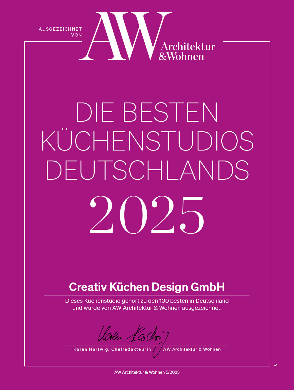A&W - Architektur & Wohnen Wir sind überglücklich: CREATIVE KÜCHEN DESIGN GmbH gehört 2025 erneut zu den 100 besten Küchenstudios Deutschlands! Diese Anerkennung zeigt, dass unser Anspruch an Design, Qualität und Funktionalität geschätzt wird – und motiviert uns, jeden Tag noch ein Stück besser zu werden. Ein riesiges Dankeschön an unser engagiertes Team 💛 und an unsere Kundinnen und Kunden, die uns ihr Vertrauen schenken und uns inspirieren, immer neue Maßstäbe zu setzen! |